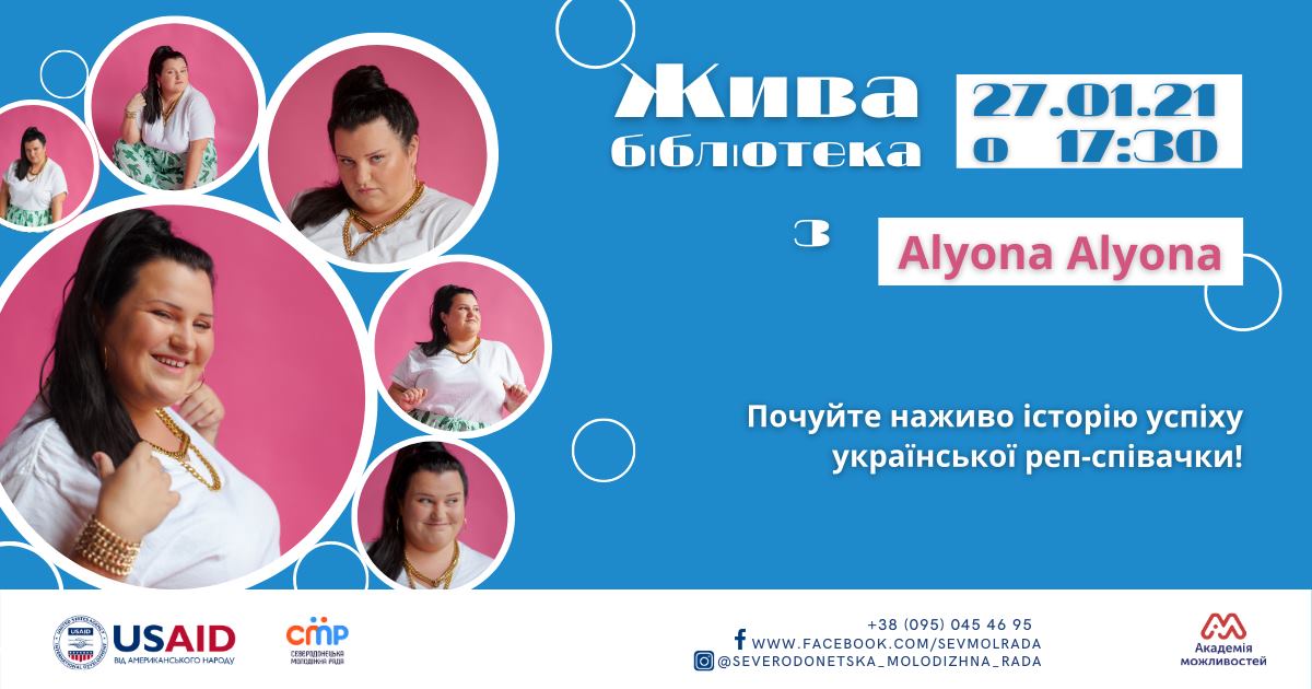 Команда громадської організації "Сєверодонецька молодіжна рада" організовує онлайн-захід "Жива бібліотека". Зірковим спікером п'ятого онлайн-заходи "Жива бібліотека" стане реп-виконавиця Alyona Alyona.