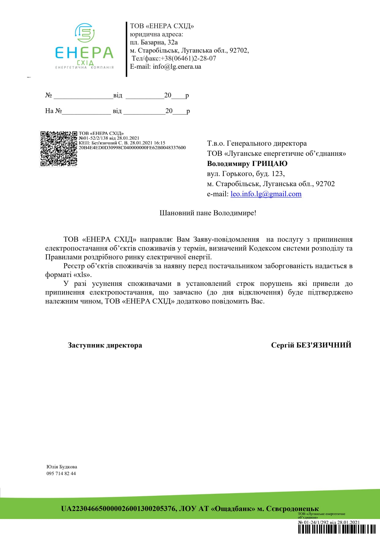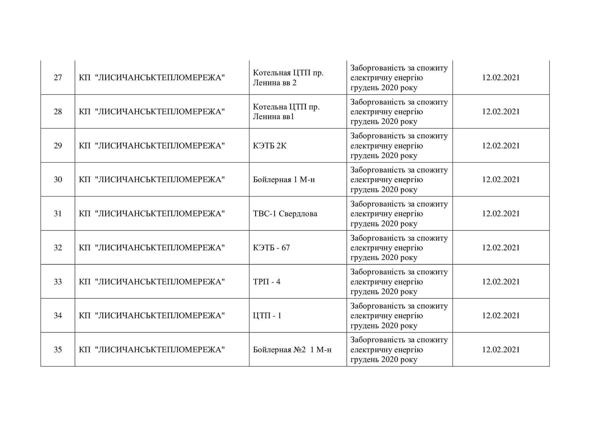 "Змушені 12.02.2021 року знеструмити усі об'єкти КП "Лисичанськтепломережа" за заявкою компанії-постачальника електричної енергії ТОВ "ЕНЕРА СХІД", - йдеться в повідомленні.