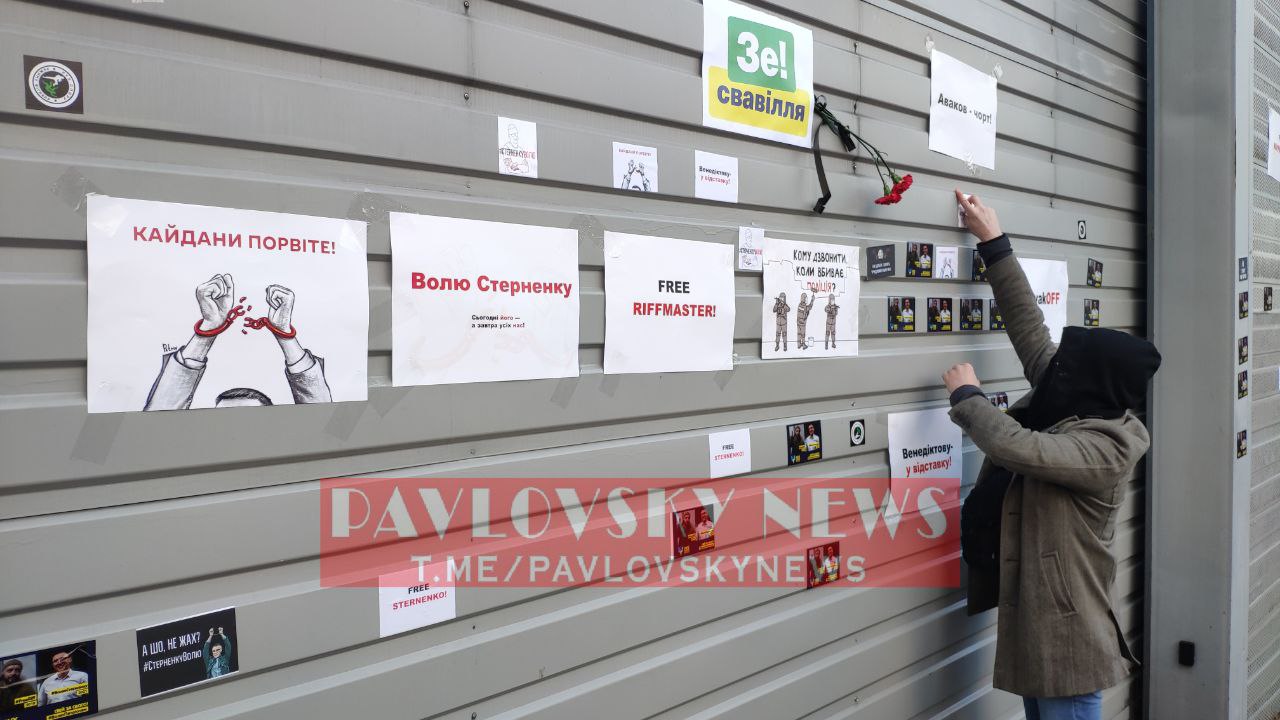 Протестуючі принесли з собою плакати з вимогами звільнити Стерненка і Антоненка. Також вони обклеїли паркан і ворота резиденції стікерами: "Венедіктову - у відставку", "Аваков - чорт", "Волю Стерненку", "Free Riffmaster".