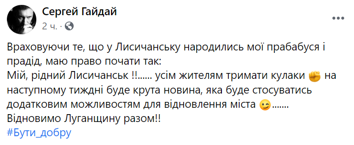 Мій рідний Лисичанськ! Усім жителям тримати кулаки! На наступному тижні буде крута новина, яка буде стосуватись додаткових можливостей для відновлення міста", - написав Гайдай у Фейсбуці.