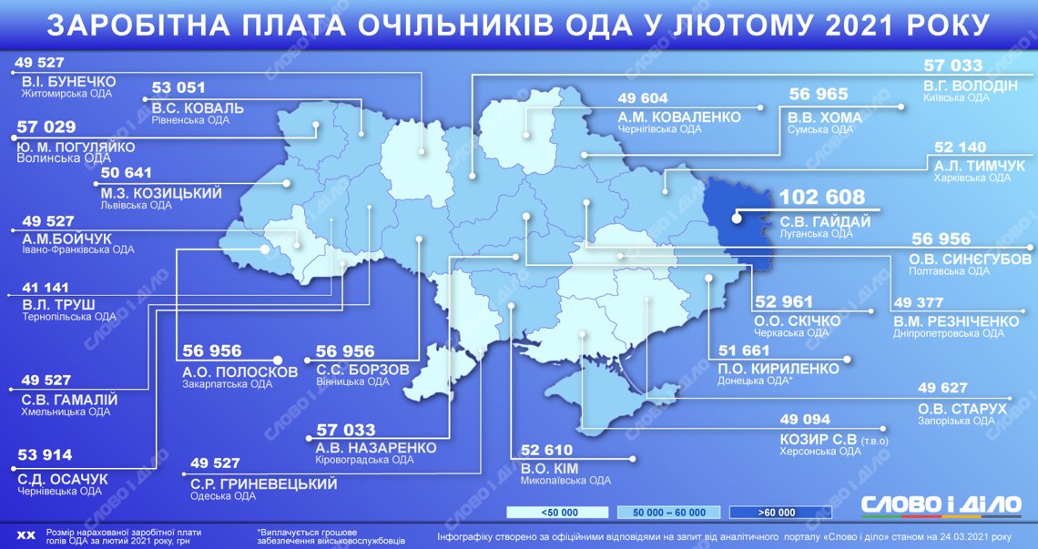 На інфографіці журналісти видання вказали, скільки заробили в лютому 2021 року глави областей. На цій карті дивовижним чином виділяється Луганщина: будучи одним з найбідніших і найдепресивніших регіонів України, наша область має найбагатшого керівника.