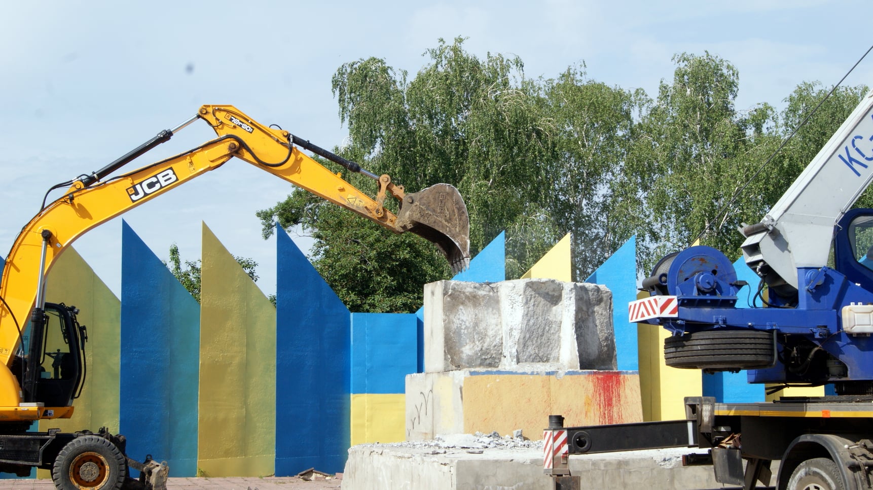 Як зазначається, сьогодні з самого ранку тривають роботи на площі Перемоги. Спецтехніка працює над демонтажем постаменту колишнього пам’ятника В.І.Леніну . Загальна вага конструкції, що демонтується, понад 100 тон.