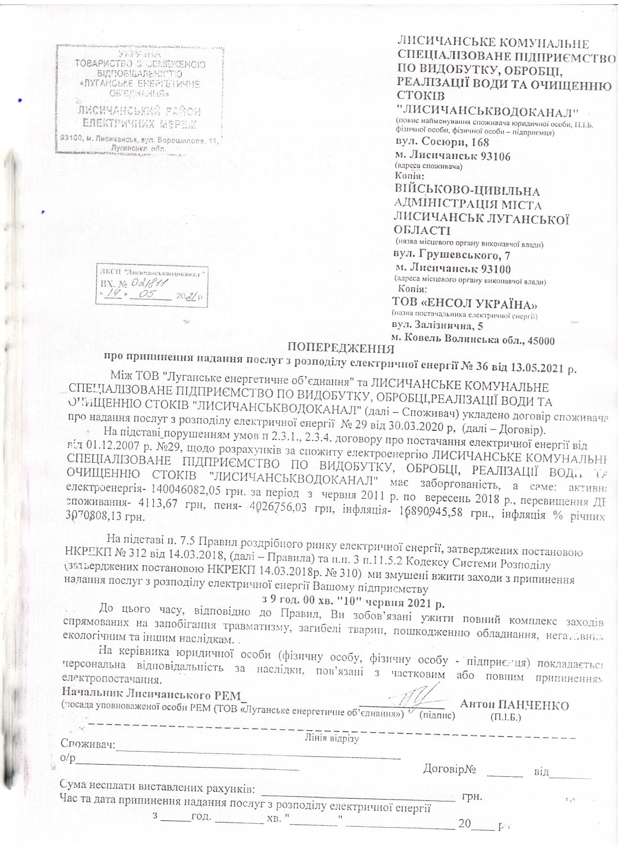 "Згідно з повідомленням Лисичанського РЕМ (ТОВ "Луганське енергетичне об'єднання") про припинення надання послуг з розподілу електричної енергії № 36 від 13.05.2021 р., 10 червня 2021 р. з 9 год. 00 хв. буде припинено надання послуг з розподілу електричної енергії ЛКСП "Лисичанськводоканал", тому буде припинено водопостачання жителям м. Лисичанськ, Привілля, Новодружеськ. Жителів цих міст просимо зробити необхідний запас води", - йдеться в повідомленні.