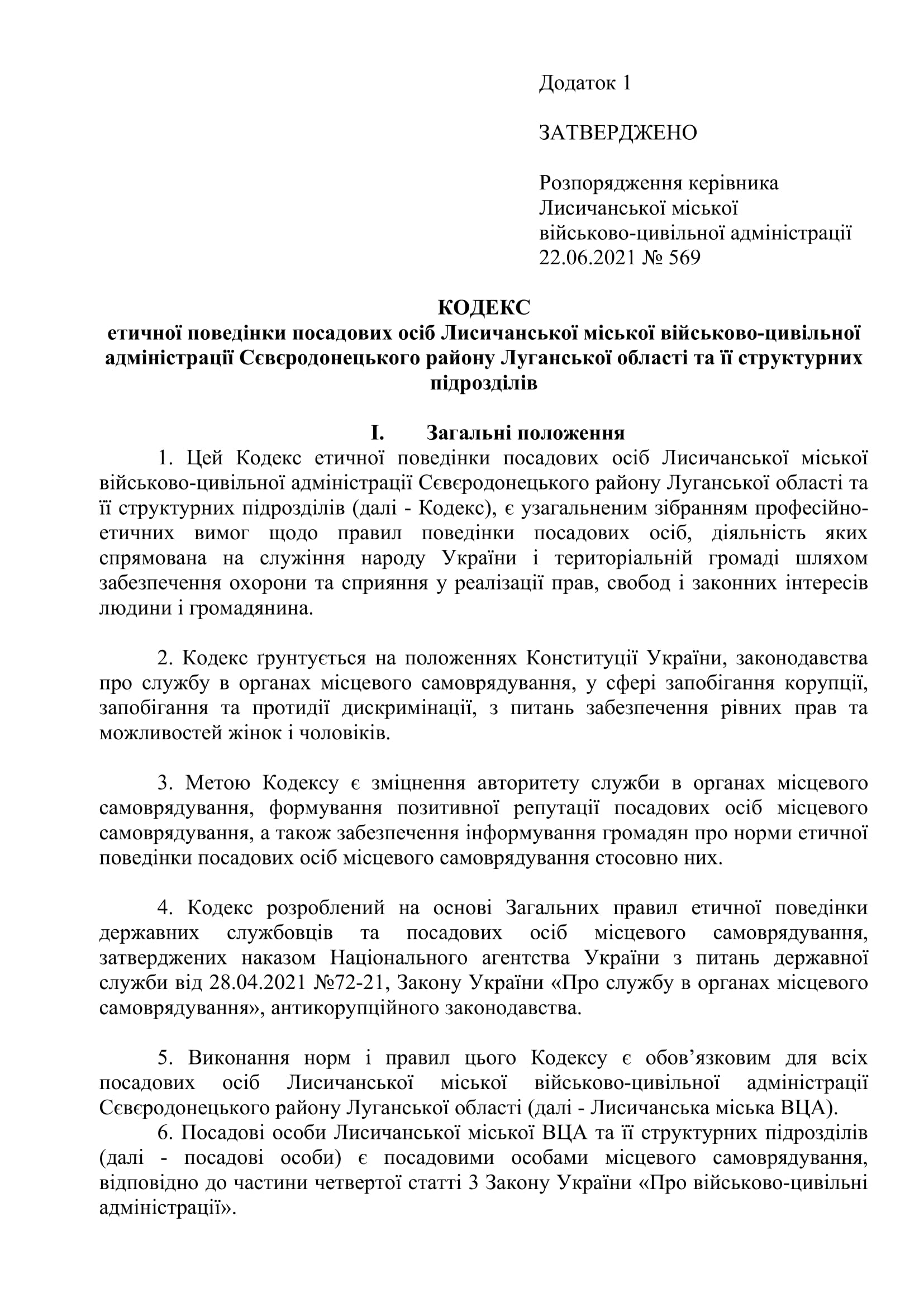 Керівник Лисичанської міської ВЦА Олександр Заїка затвердив "Кодекс етичної поведінки посадових осіб Лисичанської міської військово-цивільної адміністрації Сєвєродонецького району Луганської області та її структурних підрозділів".