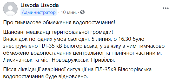 Внаслідок погодних умов сьогодні, 5 липня, о 16.30 було знеструмлено ПЛ-35 кВ Білогорівська, у зв’язку з чим тимчасово обмежено водопостачання центральної та північної частини м. Лисичанськ та міст Новодружеськ, Привілля.