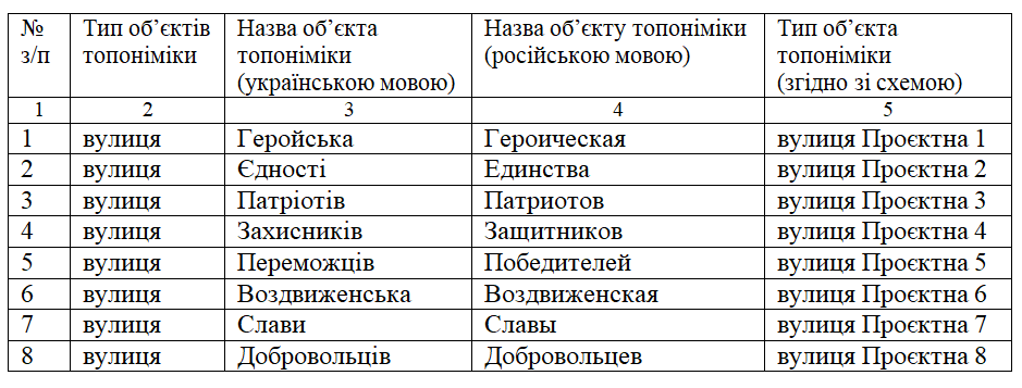 Нові вулиці будуть носити назви: Геройська, Єдності, Патріотів, Захисників, Переможців, Воздвиженська, Слави, Добровольців.