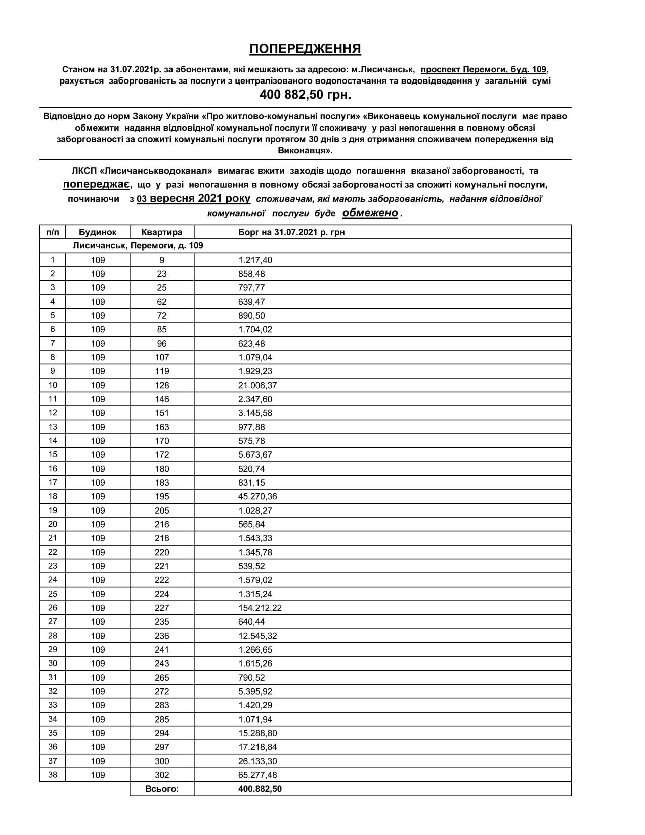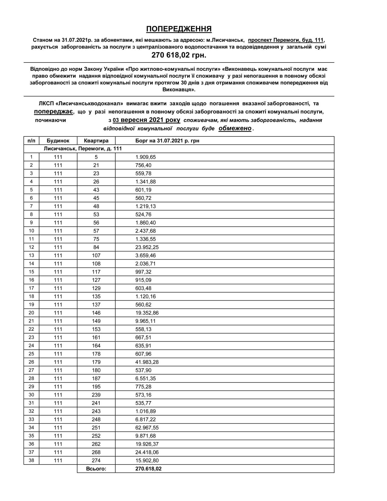 "ЛКПС "Лисичанськводоканал" вимагає вжити заходів щодо погашення зазначеної заборгованості та попереджає, що у разі непогашення в повному обсязі заборгованості за спожиті комунальні послуги, починаючи з 3 вересня 2021 року споживачам, які мають заборгованість, надання відповідної комунальної послуги буде обмежено", - йдеться в повідомленні водоканалу.