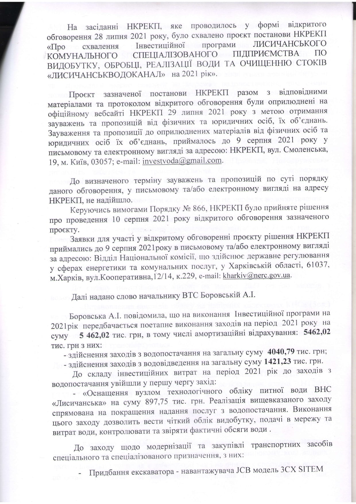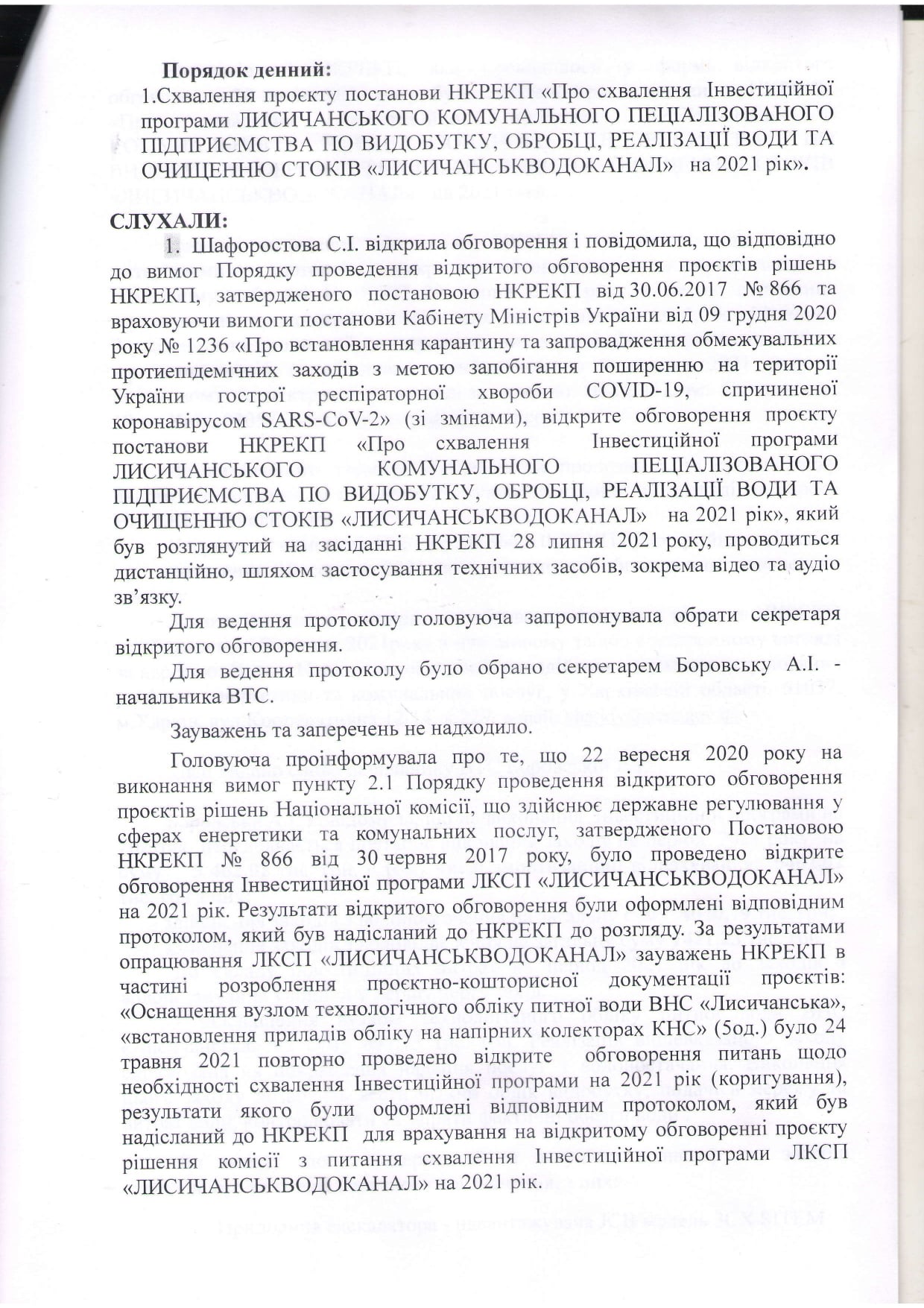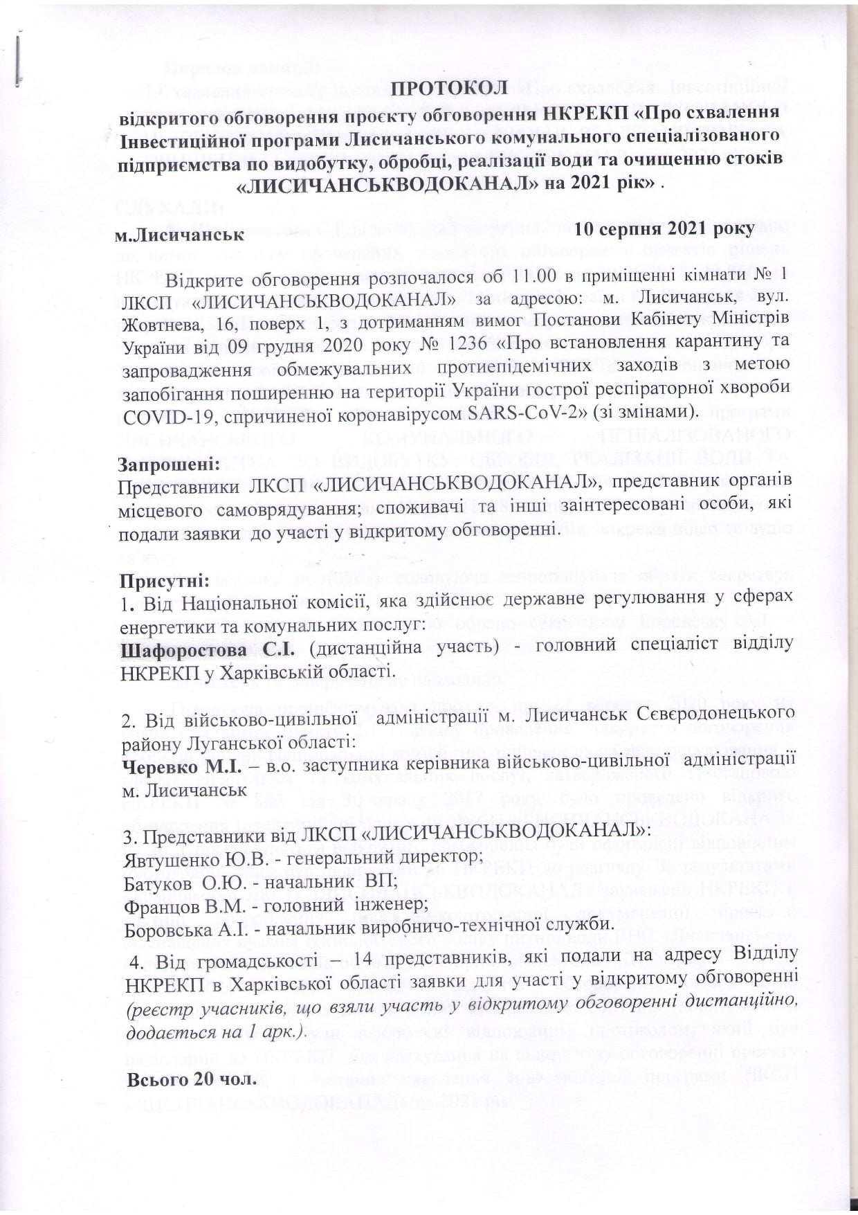 У вівторок, 10 серпня, в Лисичанську відбулося відкрите обговорення проєкту постанови НКРЕКП "Про схвалення Інвестиційної програми Лисичанського комунального спеціалізованого підприємства з видобутку, обробки, реалізації води та очищення стоків "Лисичанськводоканал" на 2021 рік".