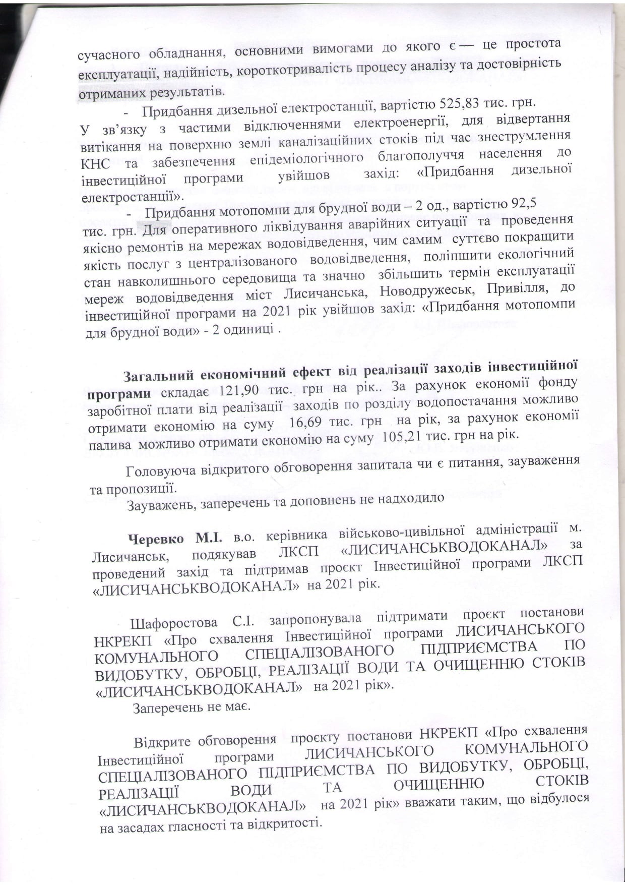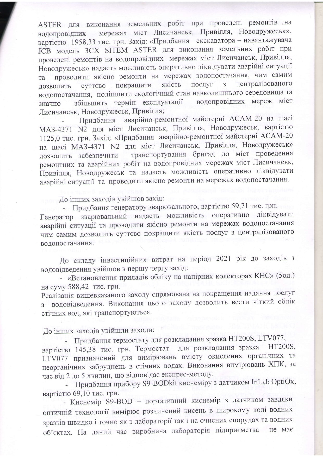 Як повідомила начальник виробничо-технічної служби "Лисичанськводоканалу" Боровська А. І., реалізація інвестиційної програми на 2021 рік передбачає поетапне виконання заходів на суму 5, 462 млн гривень:
