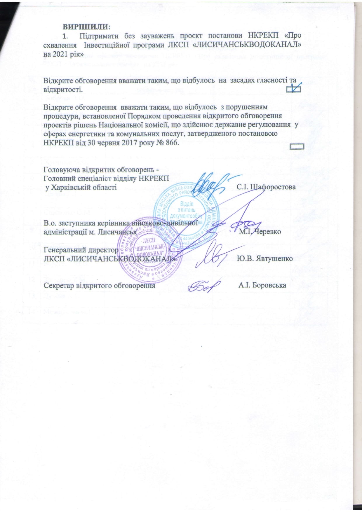 Протокол відкритого обговорення оприлюднив водоканал Лисичанська у Facebook, передає Час Пік.