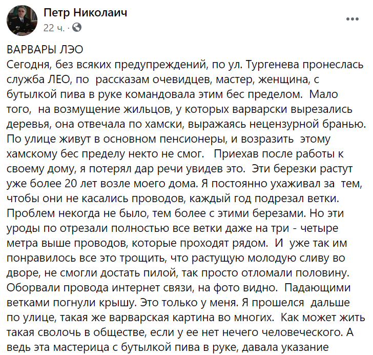 "Приїхавши після роботи до свого дому, я втратив дар мови, побачивши це. Ці берізки ростуть вже понад 20 років біля мого будинку. Я постійно доглядав за тим, щоб вони не торкалися проводів, щороку підрізав гілки. Проблем ніколи не було, тим більше з цими березами. Але ці виродки повідрізали повністю всі гілки навіть на три-чотири метри вище проводів, які проходять поруч. І вже так їм сподобалося все це трощити, що зростаючу молоду сливу у дворі, не змогли дістати пилкою, так просто відламали половину. Обірвали дроти інтернет зв'язку. Падаючими гілками погнули дах", - пише автор публікації.
