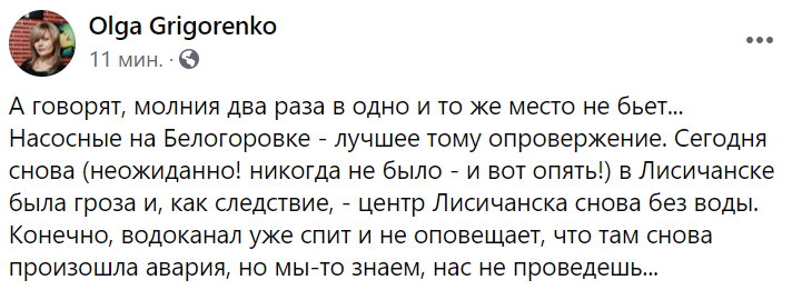 Раніше вже неодноразово, протягом декількох років удари блискавки або сильні пориви вітру ставали причиною знеструмлення насосних станцій. Цього разу, ймовірно, відключилася Білогорівська насосна станція, що качає воду на центр Лисичанська, Пролетарськ, Новодружеськ і Привілля.