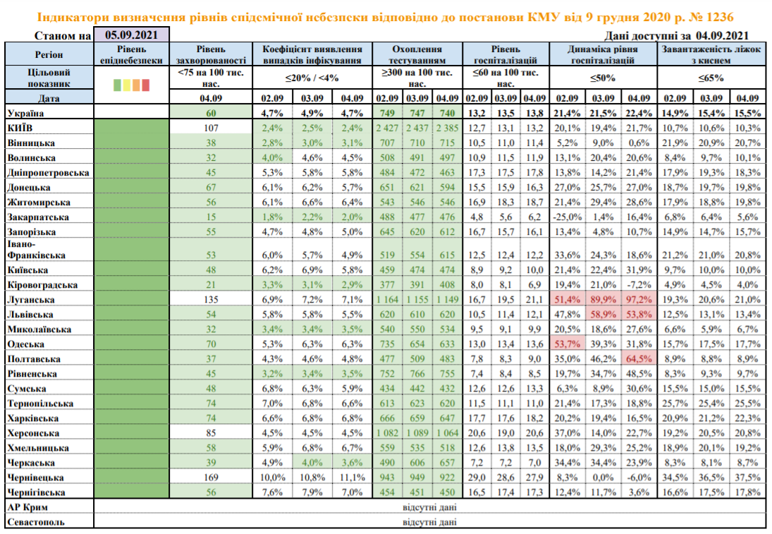За даними Міністерства охорони здоров'я на 5 вересня, рівень захворюваності COVID-19 не відповідає "зеленій" зоні в Луганській, Херсонській, Чернівецькій областях та Києві, повідомляє Час Пік.