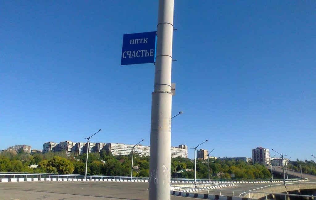Так, на залізничному вокзалі Луганська біля естакади на одній з платформ, звідки відправляються автобуси, з'явилася табличка "ППТК Щастя" (ППТК - "пункт прикордонного та митного [таможенного] контролю").