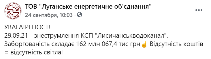 Крім того, ТОВ "Луганське енергетичне об'єднання" оприлюднило попередження про знеструмлення "Лисичанськводоканалу" 29 вересня через багатомільйонні борги.
