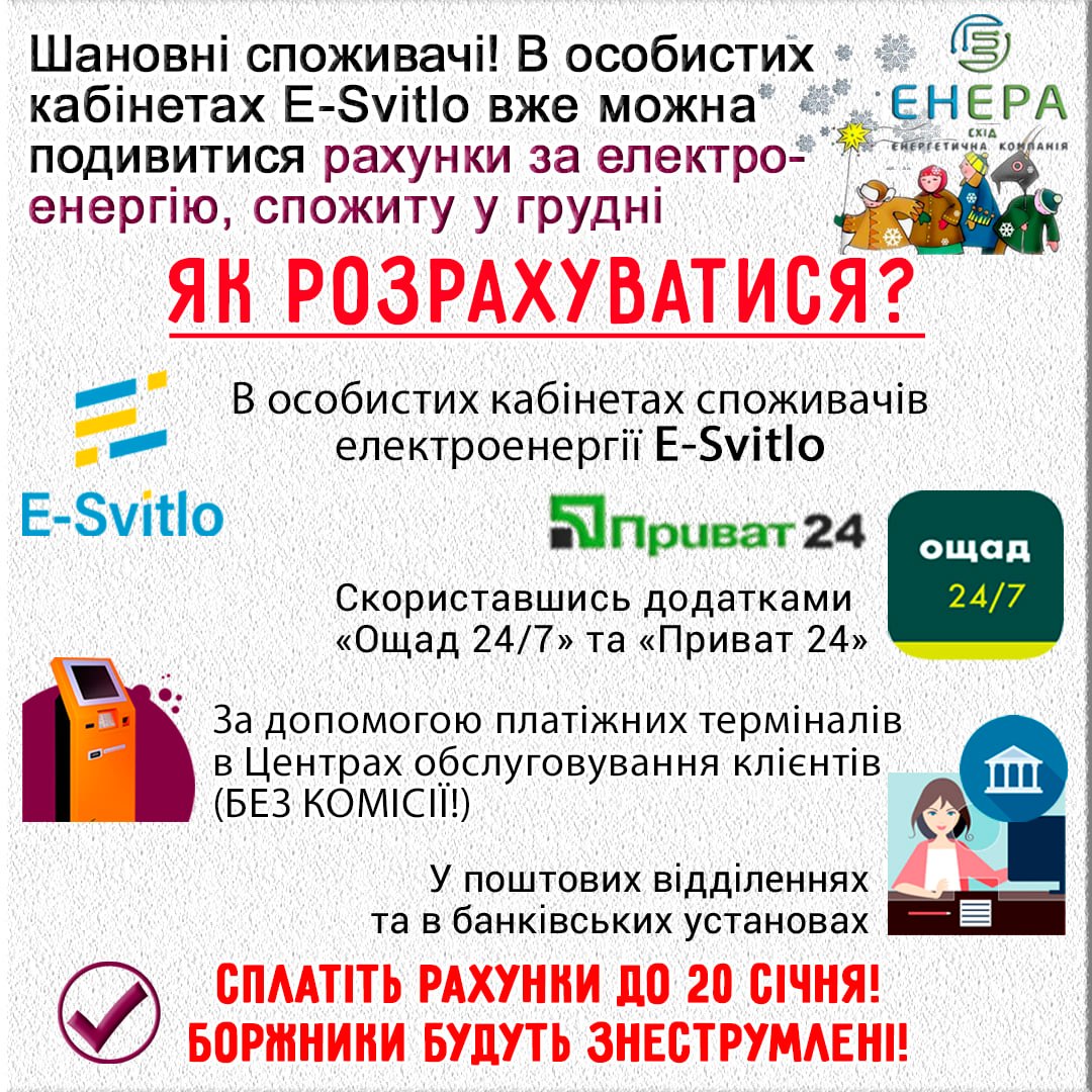 Як повідомляють у "ЕНЕРА СХІД", в особистих кабінетах побутових споживачів електроенергії Луганської області E-Svitlo вже з'явилися рахунки за електроенергію, спожиту у грудні. Сплатити рахунки потрібно до 20 січня.