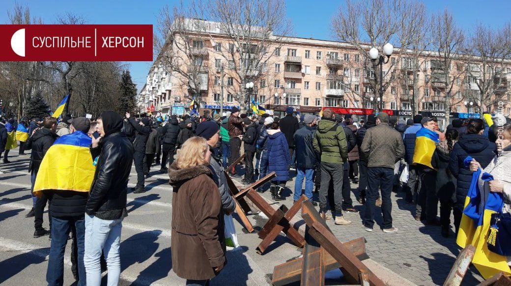 На підтвердження того, що Херсон не має наміру підкорятися російським окупантам, сьогодні кілька тисяч городян вийшли на мирний протест проти загарбників. Багато людей прийшли з українськими прапорами та плакатами. Учасники акції скандували: "Додому", "Додому поки живий", "Україна понад усе", "Слава нації – смерть ворогам", "Російський солдат, йди на**й", "Херсон – це Україна", "Росія – параша, перемога буде наша”.