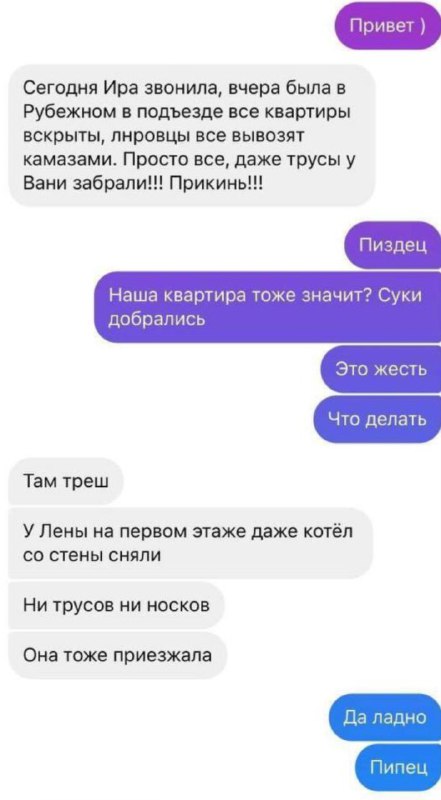 "Всі квартири в під'їзді розкриті, лнрівці все вивозять КамАЗами. Навіть чоловічі труси забрали",