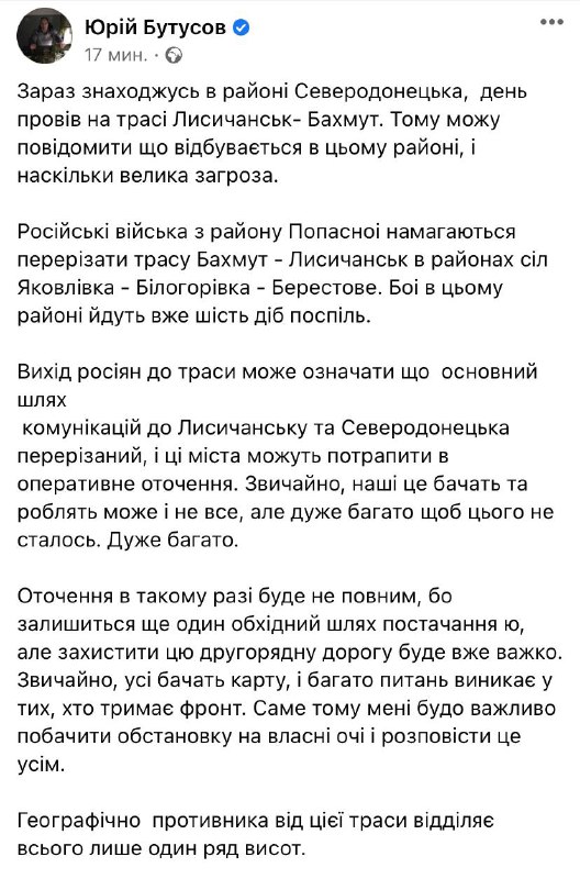 Вихід росіян на трасу може означати, що основний шлях комунікацій до Лисичанська та Сєвєродонецька перерізаний, і ці міста можуть потрапити до оперативного оточення. Про це у Фейсбук повідомляє журналіст Юрій Бутусов, передає Час Пік.