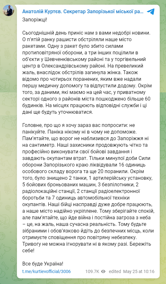 Вранці 25 травня російські окупанти завдали ракетного удару по Запоріжжю. Три ракети потрапили до об'єктів у Шевченківському районі міста та до торгового центру в Олександрівському районі, є жертви.