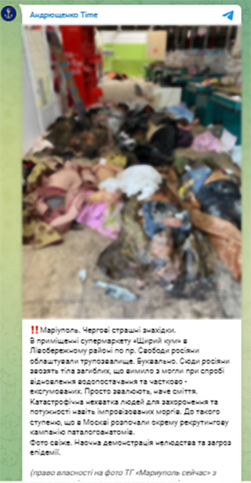 "У приміщенні супермаркету "Щирий кум" у Лівобережному районі по пр. Свободи росіяни облаштували трупозвалище. Буквально. Сюди росіяни звозять тіла загиблих, які вимило при спробі відновлення водопостачання та частково - ексгумованих. Просто звалюють як сміття", - повідомив Андрющенко.