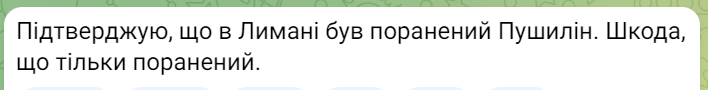 "За непідтвердженою інформацією, головний клоун так званої «ДНР» Пушилін був поранений у місті Лиман Донецької області. А всі відео, що зараз публікуються з ним - старі консерви".