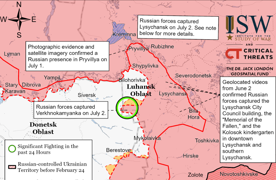 У звіті ISW від 2 липня йдеться, що "кадри з геолокацією показують, що російські війська безперешкодно ходять північними та південно-східними кварталами Лисичанська таким чином, що це передбачає, що українських сил мало чи зовсім немає в місті станом на 2 липня".
