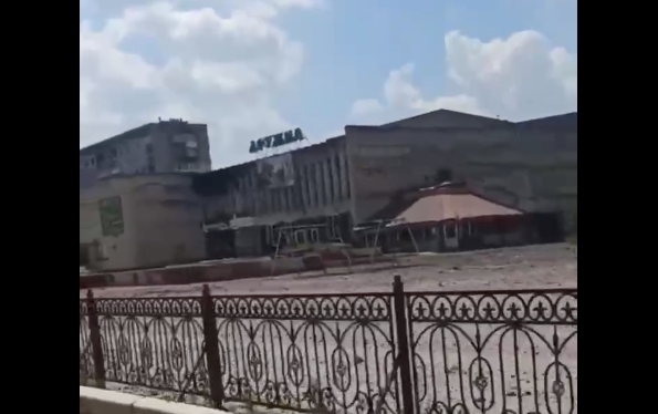 Також можна помітити звалену телевежу. Магазин "Городок", навпроти телевежі, зруйнований.