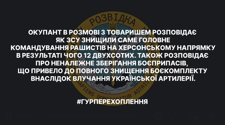 Окупант в розмові з товаришем розповідає як ЗСУ знищили "саме головне" командування рашистів на Херсонському напрямку, в результаті чого - 12 двохсотих.