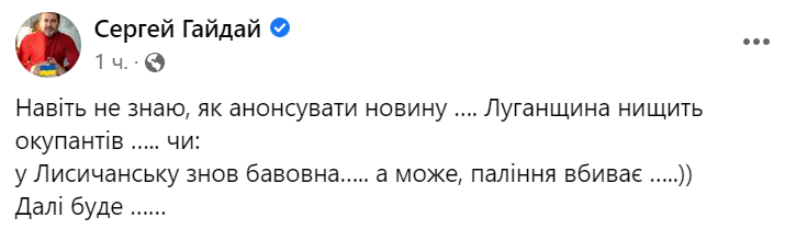 "Навіть не знаю, як анонсувати новину... Луганщина нищить окупантів... чи: у Лисичанську знов бавовна… а може, паління вбиває...)) Далі буде", - написав він.