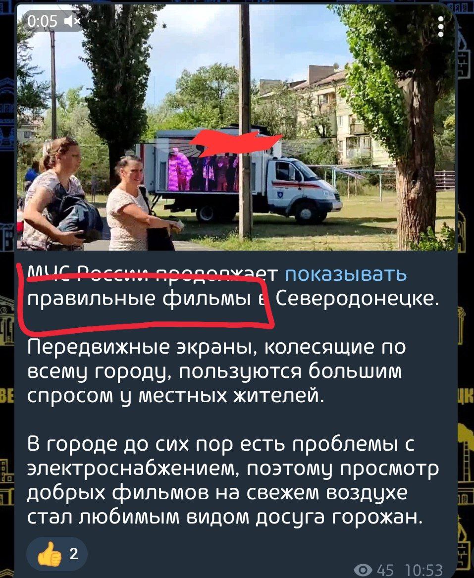 У Сєвєродонецьку МНС РФ продовжує возити містом пересувні екрани, на яких показують "правильні фільми". Окупанти заявляють, що перегляд таких фільмів став для мешканців міста, де вже кілька місяців немає електроенергії, "улюбленим видом дозвілля".
