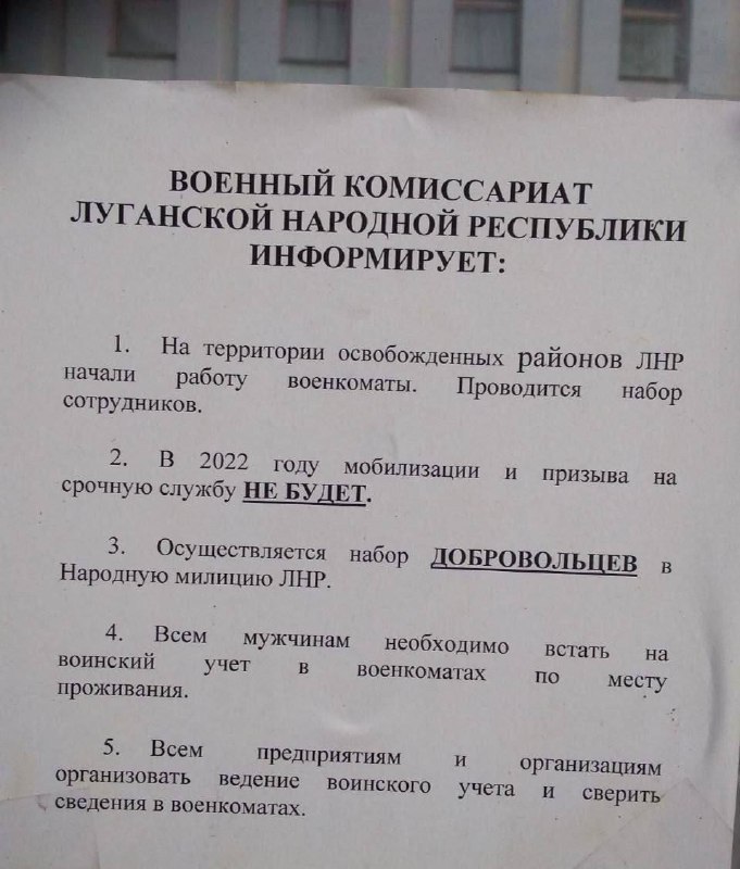 На оголошеннях від так званого "воєнного комісаріату ЛНР" йдеться, що всі чоловіки на окупованих після 24 лютого територіях Луганської області мають стати на військовий облік. При цьому вони обіцяють, що у 2022 році – мобілізації та призову на службу "не буде!".