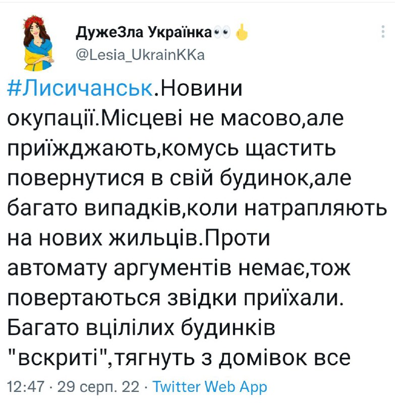 "Багато повертаються. Комусь щастить, а комусь ні. Багато випадків, коли у будинках уже заселилися "нові" мешканці, а проти автомата аргументів немає", - повідомляють у мережі.