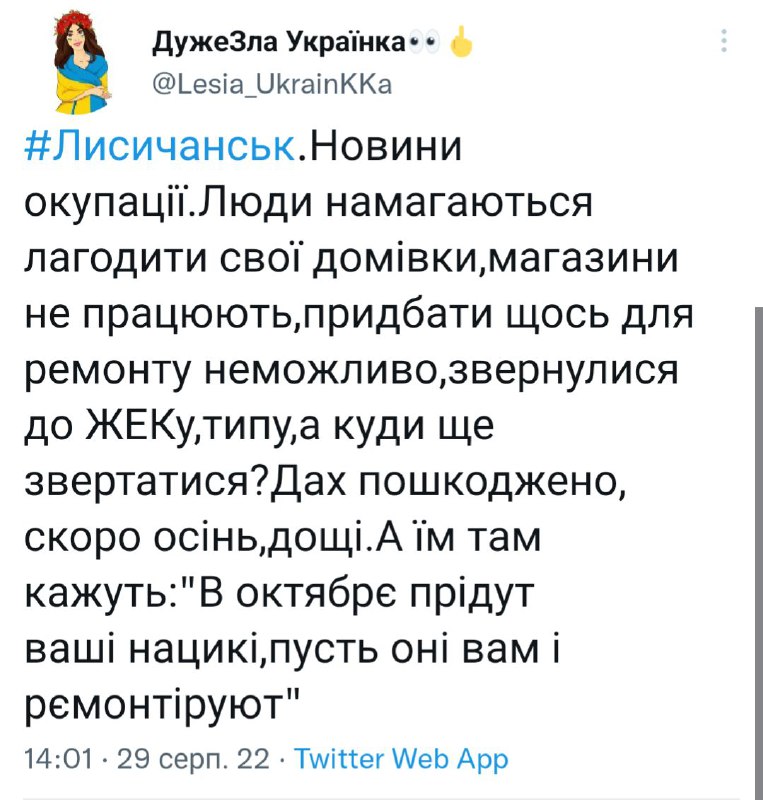 "Люди намагаються лагодити свої будинки, придбати щось для ремонту неможливо. Вони звертаються до ЖЕКу, але у відповідь їм кажуть, що у жовтні прийдуть ваші "нацики" - нехай і ремонтують", - пише мешканка Лисичанська.