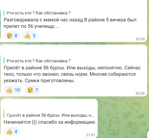 "Приліт у районі 56 бурси. Або виходи, незрозуміло. Зараз тихо, щойно дзвонив, зв'язок норм. Багато хто збирається їхати. Сумки приготовлені",