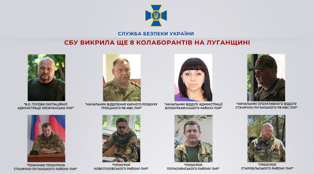 Служба безпеки України продовжує системну роботу з викриття колаборантів та зрадників. Зібрано докази добровільної співпраці з ворогом з боку ще 8 посадових осіб на тимчасово окупованій території Луганщини.