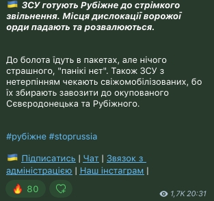 За даними Telegram-каналу, до Рубіжного та Сєвєродонецька збираються завозити "свіжомобілізованих", яких "ЗСУ з нетерпінням чекають".