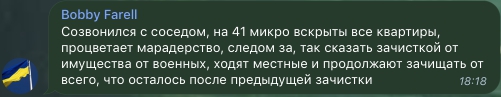 Зокрема, з'явилося повідомлення про те, що в одному з районів Лисичанська розкрито всі квартири. На чужі речі також "задивляються" місцеві мешканці. Деякі користувачі мережі повідомляють, що мародери забирають усе - навіть речі з шаф.