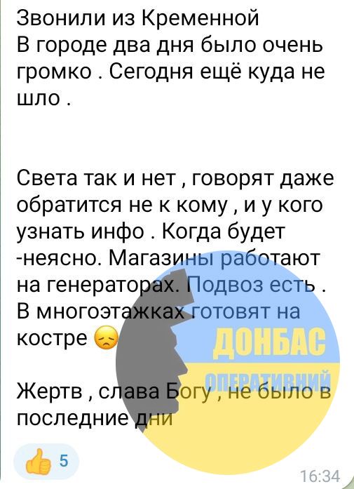 Електрики в Кремінній немає і невідомо, коли буде, звернутися з цього приводу людям нема до кого. Магазини працюють на генераторах, продукти привозять. Жителі багатоповерхівок готують їжу на багаттях.