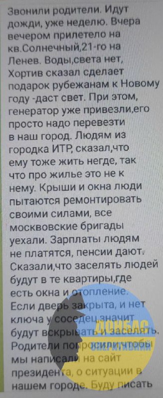 У Рубіжному немає світла та води. Мер-зрадник Хортів пообіцяв мешканцям "подарунок" до Нового року – дати світло. При цьому генератор вже привезли, його просто треба перевезти до міста. Від прохань рубіжан надати житло замість зруйнованого так званий "мер" відхрещується.