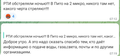 "ГТВ обстріляли вночі! У Піто на 2 мікро, нікого там немає", - пишуть у мережі.