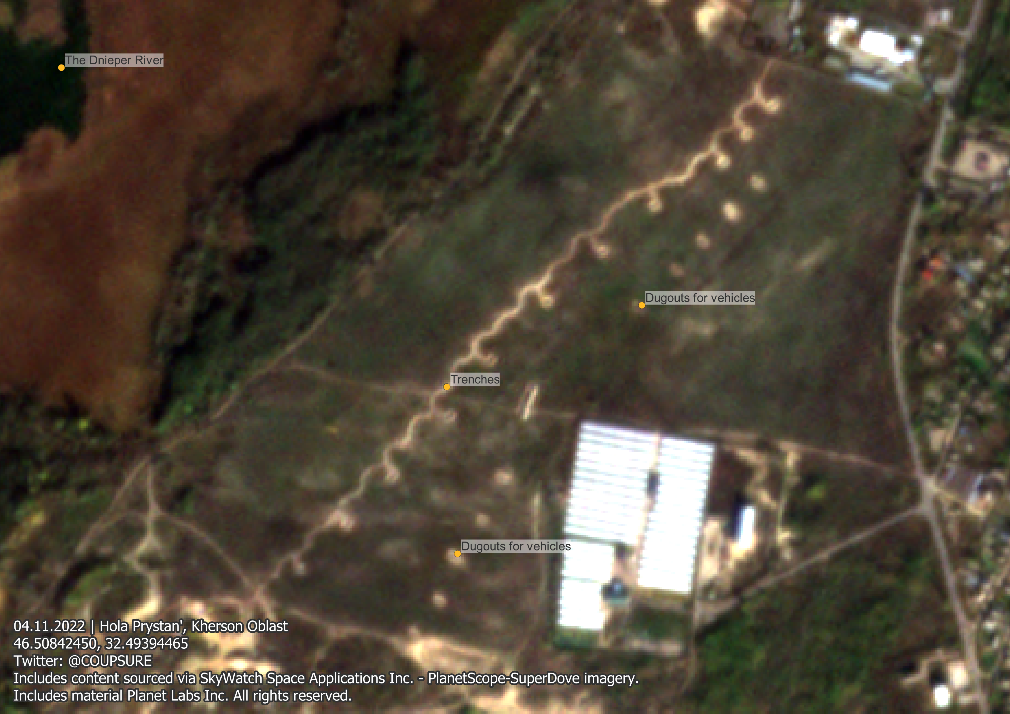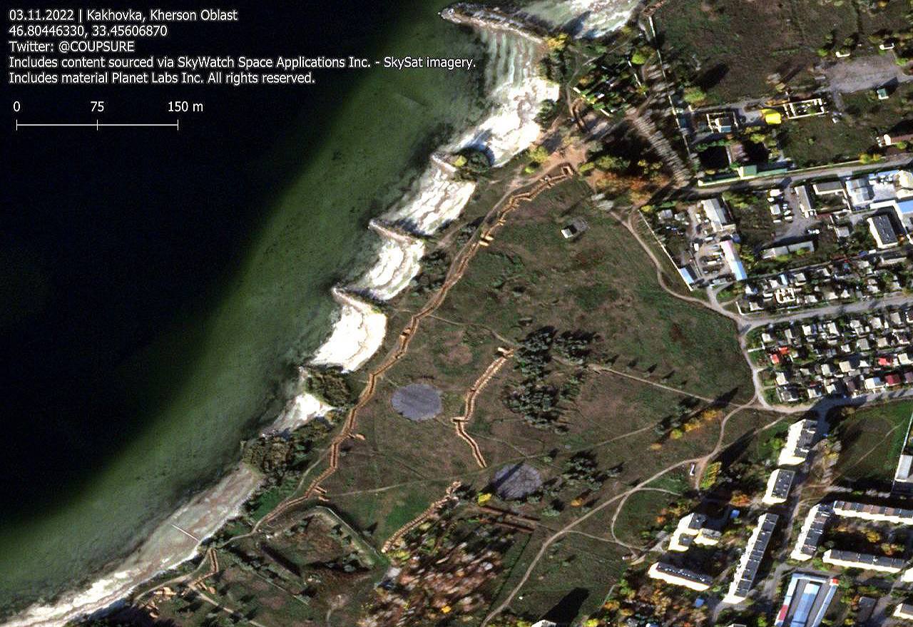 Наразі росіяни будують три лінії траншей та дзотів на лівому березі Дніпра. Для оборонних позицій використовуються природні та штучні перепони, такі як річка Дніпро та численні канали у Херсонській області.
