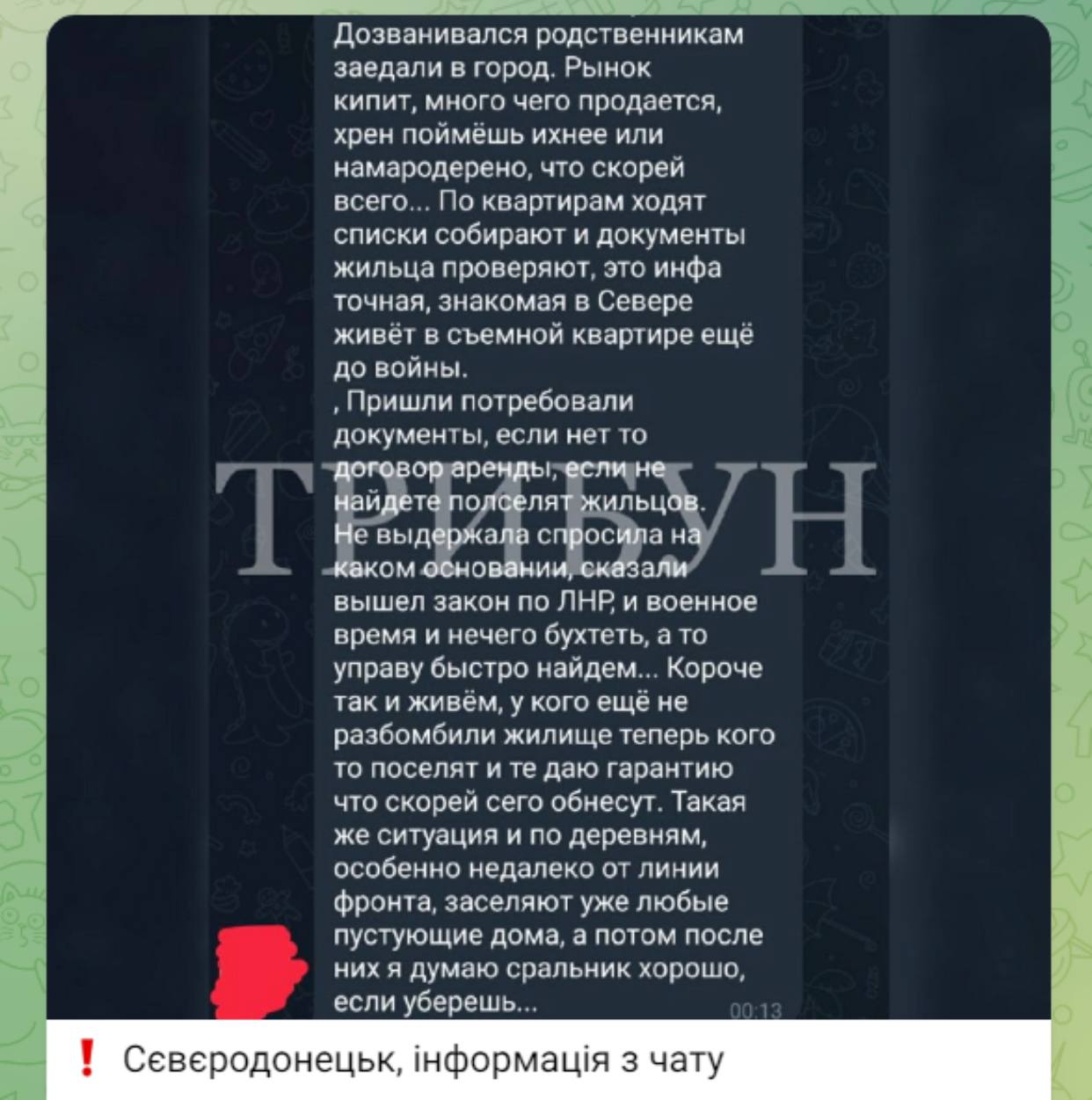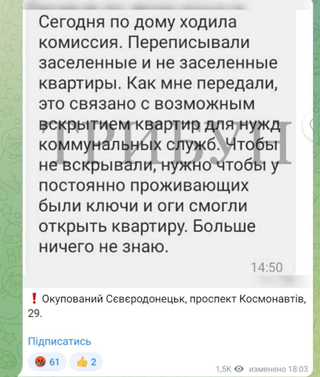 У тимчасово окупованому Сєвєродонецьку Луганської області "комісія" ходить по будинках у пошуках порожніх квартир. Якщо квартиру відкрити нема кому - її розкриватимуть, а після - заселятимуть нових "господарів".