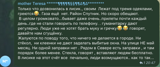 За словами користувачів мережі, яким вдалося вийти на зв'язок з Лисичанськом, у місті "гучно". Люди, які залишилися без опалення та електроенергії, змушені грітися під ковдрами. На щастя ще немає сильних морозів. Навряд чи ковдра врятує при -20 градусах.