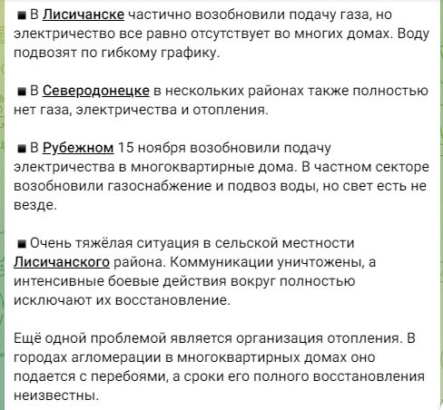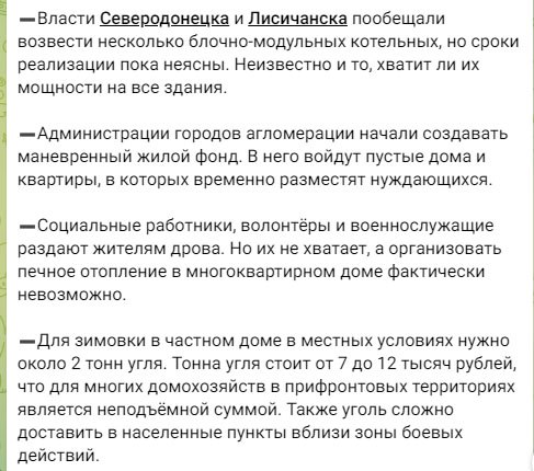 "У Лисичанську дров не вистачає, а організувати пічне опалення у багатоквартирних будинках неможливо. У сільській місцевості Лисичанського району комунікації знищені повністю і не підлягають відновленню. Тонна вугілля коштує від 7 до 12 тисяч рублів, що для багатьох є непідйомною сумою", - говориться повідомленні.