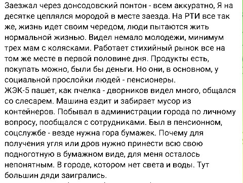 "ЖЕК-5 працює, як бджілка - двірників бачив багато, спілкувався зі слюсарем. Машина їздить і забирає сміття з контейнерів. Побував у адміністрації міста з особистого питання, поспілкувався зі співробітниками. Був у пенсійному - скрізь потрібна гора папірців. Чому для отримання вугілля або дров треба принести все у паперовому вигляді, для мене залишилося незрозумілим. У місті, якому немає світла та води. Тут великі дяді загралися", - зазначив місцевий житель.