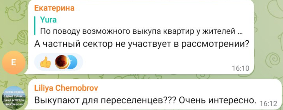 Як можна зрозуміти з обговорення, питання про "викуп" зараз розглядається російською владою. "Викуп" передбачає переселення до інших регіонів РФ. Крім того, людей цікавить питання "підселення", адже може виявитися, що квартира вже зайнята, і де у такій ситуації жити власнику - незрозуміло.