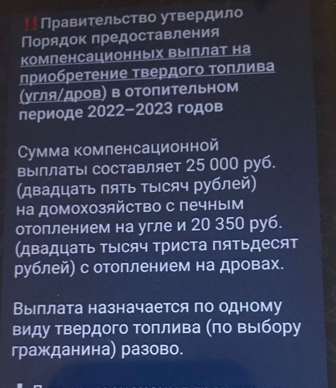 "Уряд затвердив порядок надання компенсаційних виплат на придбання твердого палива (дров та вугілля). 25 тис. рублів на домогосподарства з пічним опаленням на вугіллі, 20 300 рублів з опаленням на дровах", - йдеться у повідомленні.