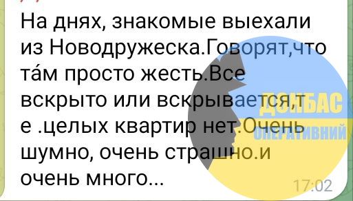 "Днями знайомі виїхали з Новодружеська. Кажуть, що там просто бляха. Все розкрито і розкривається, тобто цілих квартир немає. Дуже галасливо і дуже страшно", - пишуть очевидці.