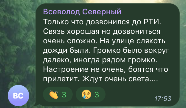 За словами користувача мережі, якому вдалося вийти на зв'язок із Лисичанськом, до міста додзвонитися складно, але поговорити можливість є. У місті сльота. Звуки війни чути іноді далеко, іноді поряд. Люди бояться нових "прильотів".